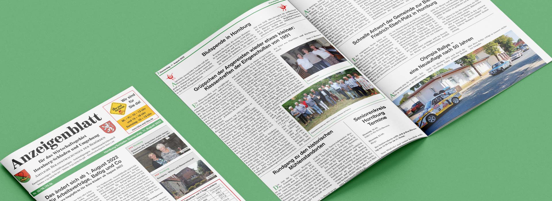 Hornburger Anzeigenblatt heißt Vor-Ort-Information. So grenzen wir uns von Tageszeitungen und sonstigen Wochenzeitungen klar ab. Ihre Heimatzeitung für die Samtgemeinde Schladen, Oderwald, Asse und Osterwieck und Umgebung.